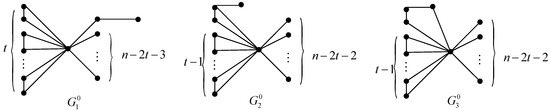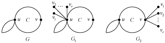 Case 2. If , is the class of bicyclic graphs. By Lemma 4, we conclude that contains two cycles attached to a common vertex u, and all cut-edges are all pendent edges (if any). Further, by Lemmas 8 and 6, all pendent edges (if any) are also attached to u. Finally, by Lemma 5, the two cycles must be triangles, that is, . This obtains the desirable results.