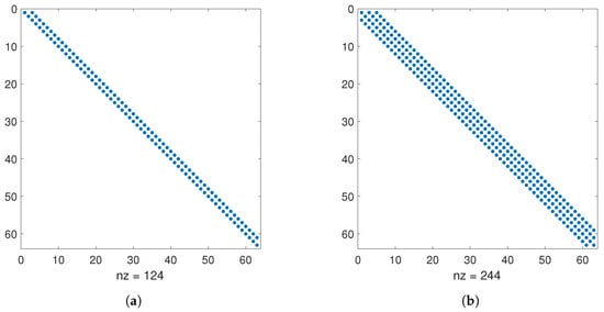 for . The matrices and are bi-diagonal and quad-diagonal matrices, respectively, whose non-zero elements are presented in Figure 1. Due to the sparsity, solving Equation (39) for can be performed efficiently with operations for all j. Once it is performed so that all elements of the matrix are obtained, the matrix can be computed from