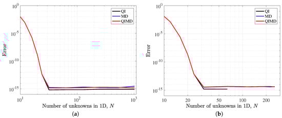 Errors of numerical solutions of 2-D (plotted in (a)) and 3-D (plotted in (b)) Poisson equations with a the high number of N. In both 2-D and 3-D problems, the errors of the proposed method (QIMD) do not rise as N increases. The proposed method shows the same order of accuracy as the quasi-inverse method and the matrix diagonalization method.