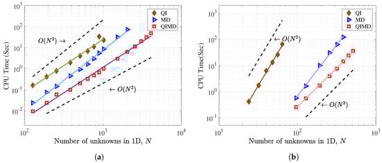 Comparison of CPU times among the Quasi-Inverse (QI), Matrix Diagonalization (MD), and Quasi-Inverse Matrix Diagonalization (QIMD) methods as a function of the one-dimensional number of unknowns in solving (a) a 2-D Poisson equation and (b) a 3-D Poisson equation. The results of the best linear regression associated with the lines in the figure are represented in Table 2. Here, and operation lines in (a), and and operation lines in (b) are plotted for comparison.