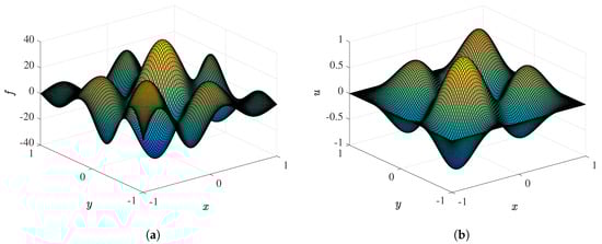 In this section, our quasi-inverse matrix diagonalization method is applied to several 2-D and 3-D PDEs, and the numerical results are presented. The numbers of Chebyshev modes to discretize solutions at each spatial direction do not need to be identical. Nonetheless, we use the same numbers of Chebyshev modes N at each spatial direction in all test problems for simplicity. Numerical codes are implemented in MATLAB and operated using a 16 GB-RAM Macbook Pro with a 2.3 GHz quad-core Intel Core i7 processor. For matrix diagonalization, MATLAB’s built-in function “eig” is used to compute the matrix’s eigenvalues and eigenvectors. For inverse matrix calculation, we use MATLAB’s backslash operator.
