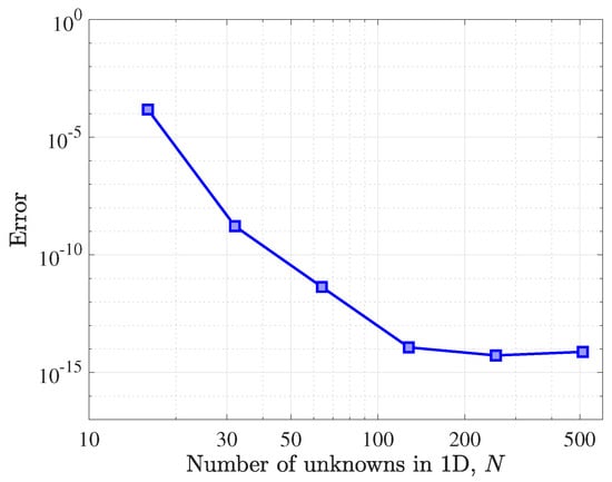 At high N, errors of numerical solutions obtained from the spectral method using Chebyshev polynomials can increase because the system of equation tends to be ill-conditioned as N increases. To be a good spectral method, the error of numerical solutions at high N should be retained near the machine accuracy and should not rise as N increases. In this aspect, to further check the error and robustness of the proposed method, we solve the Poisson problem with high N up to in 2-D and in 3-D and measure the errors of numerical solutions of the proposed method as a function of N. We present the results of this experiment in Figure 2. As shown in the figure, even at high N, the errors of numerical solutions of the proposed method retain the order of , showing high accuracy and robustness of the proposed method.