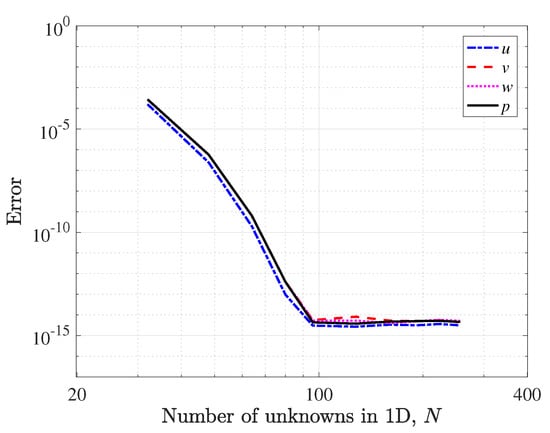 The accuracy of numerical solutions of , and p obtained using the quasi-inverse matrix diagonalization method is presented in Figure 6. The errors decay slower than the ones tested in the previous examples, but all of them show spectral convergence that reached machine accuracy around . Figure 7 shows the CPU time of the Stokes problem in a log-log scale as a function of N. When the best linear regression of the data is implemented, the slope of this graph is 2.884, approximately showing operation complexity of the 3-D Stokes problem as expected.