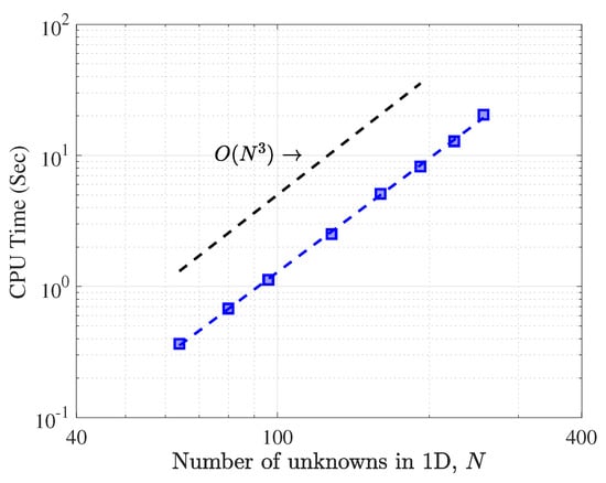 In solving the 3-D Poisson equation, as Julien and Waston claimed in [13], the operation complexity of the quasi-inverse technique is approximately . In the matrix diagonalization method, the operation complexity approximately increases from to as dimensionality of the Poisson equation rises from 2-D to 3-D. This is because the bottleneck of the matrix diagonalization method in solving the Poisson equation is computing from the dense matrix, which requires about operations per calculation, and repetition of this calculation increases from N to times. When using the quasi-inverse matrix diagonalization method to solve the 3-D problem, the most time consuming step is also computing , but the left-hand side matrix in Equation (58) is sparse where the bandwidth is four, and therefore can be solved in operations. Because this calculation is repeated times in the 3-D problem, the total operation complexity of the quasi-inverse matrix diagonalization method becomes as shown in Table 2.