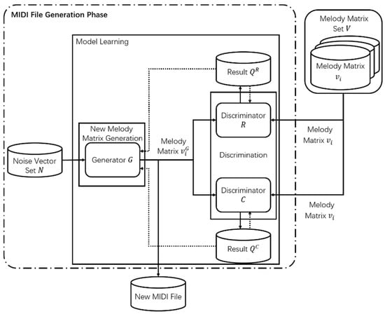 Therefore, is the generator, and are the discriminators, is a set of noise vectors, is a set of melody matrices encoded with a set of melody tracks, and is a melody matrix extracted from . The discriminators C and R derive the determination results according to the correlation between each bar and the rationality of the bars, respectively. Based on each determination result, they are trained by maximizing the loss, as shown in Equations (1) and (2) using () and (), respectively.