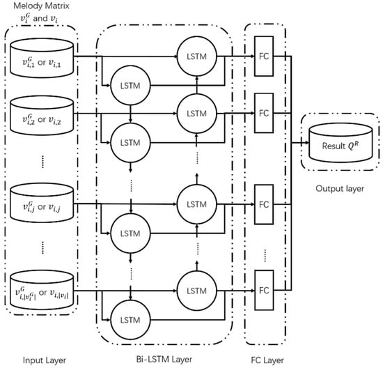 The input to G is defined as a set of noise vectors, , which consists of an equal number of noise vectors to the number of bars to be generated. The melody matrix generated through the generator is defined as . consists of an equal number of bar matrices, , to the number of bars to be generated. The LSTM layer consists of two hidden layers of the same size; the second hidden layer is connected to the FC layer. The FC layer receives each noise vector, , that passes through the LSTM layer and outputs a bar matrix, . It then generates the melody matrix, , by integrating the generated bar matrices, .