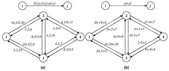 In Figure 1a we have a network flow in a generalized network with the source node 1 and the sink node 4. We suppose that , . It is easy to see that f satisfies the capacity constraints and the antisymmetry constraints, so, it is a pseudoflow. Let us calculate the residual excesses: , and . It is clear now that the pseudoflow f have not any residual deficits (excesses) and, so, it is a flow in the generalized network from Figure 1a. Obviously, . The corresponding residual network is presented in Figure 1b. In this network, we have a flow-generating cycle: whose gain factor is equal to .
