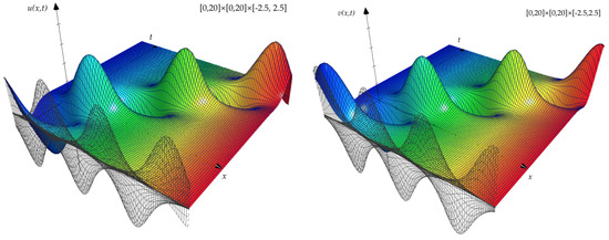Snapshots of 3D view of the solution (22) and (23), with a interchange of independent variables () and .