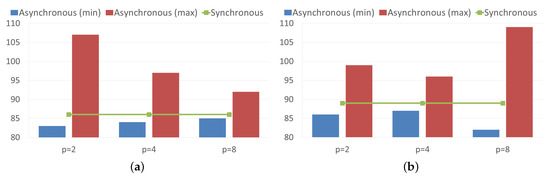 On the other hand, in the link matrices used to calculate PageRank, the number of nonzero elements per row can differ immensely. In order to balance the calculations in our parallel implementations, a nonzero elements partitioning is used, where each node has to handle approximately the same amount of nonzero elements. Generally, for the PageRank calculations, this distribution strategy behaves better than row-wise distributions and other hypergraph partitioning-based decomposition techniques; see, for example, References [18,20]. In point of fact, when nonzero element partitioning is used, the times obtained with the parallel synchronous Power algorithm were always better than those obtained with the asynchronous counterpart [25]. This partitioning has a positive influence on the performance of the synchronous version because it balances the computational work per process, while the behaviour of the asynchronous algorithm can vary immensely from an execution to another. In a synchronous implementation, the synchronization after each iteration ensures that all updated components of the iterate vector will be available at the next iteration. This availability is not true for an asynchronous implementation. From this point of view, both the convergence of the asynchronous algorithm and the number of local iterations performed in each process depend on the update order of the iterate vector components [34]. Figure 1 compares the needed iterations for reaching convergence with both the synchronous and asynchronous Power algorithms. For this purpose, the asynchronous algorithm was executed three times, and the maximum and minimum number of iterations across processes are reported in this figure. As it can be seen, the number of synchronous iterations needed for convergence of the Power method for the analyzed matrices is similar, 86 iterations for the uk-2002 matrix and 89 iterations for the it-2004 matrix. In the asynchronous case, each process performs a different number of iterations. Then, although some processes perform a number of local iterations less than the number of iterations of the synchronous model, the number of local iterations performed for the slower process increases degrading the performance. This is consistent with some observations done in previous works [34,35] about the interest of the asynchronous algorithms for load unbalanced problems or for problems executed in a heterogeneous parallel computing system, while these asynchronous model are not always advantageous for well-balanced problems like ours.