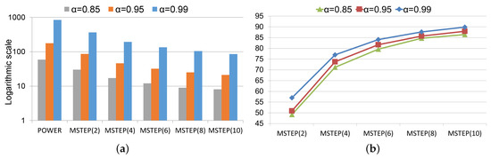 Taking into account that the work among nodes has been balanced by means of the above explained nonzero element distribution, the best strategy for designing the parallel algorithms proposed here is the one that keeps this load balancing. Therefore, at each global iteration of the algorithm, every block of the iterate vector must be updated the same number of times before all processes synchronize to get a new global iterate. However, in the hypothetical case in which the node workload may be unbalanced or when working on a heterogeneous parallel computing system, the designed algorithms allow us to perform different number of updates for each block of the iterate vector avoiding the downtime of any of the nodes and leading to a better load balancing in the parallel algorithms. Figure 2 illustrates the behaviour of the convergence rates of the Power method and the MSTEP methods for the uk-2002 matrix and setting , , and . The notation MSTEP(q) indicates that, at each global iteration, each vector block i is updated times in the algorithm before synchronizing.