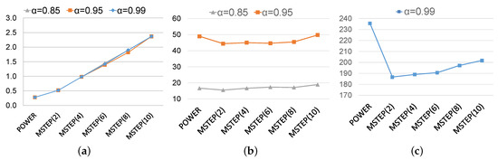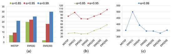 Figure 5 analyzes the effect of performing the extrapolation before running the non-stationary iterations, that is the EMS algorithm is considered. The notation EMS(r) indicates the value of r used for the extrapolation. As it is expected, simple extrapolation () is not effective. This makes sense because, from a theoretical point of view, a simple extrapolation assumes that is the only eigenvalue of modulus and this is inaccurate. In fact, it is known that the use of the simple extrapolation technique () in the Power method slows down its convergence [36]. On the other hand, the choice of r in our algorithm depends on the condition number of the problem. Given our experience with the EMS algorithm, while for a well-conditioned problem a good choice for r is , it should be chosen greater than 6 when , obtaining generally a good strategy by choosing .