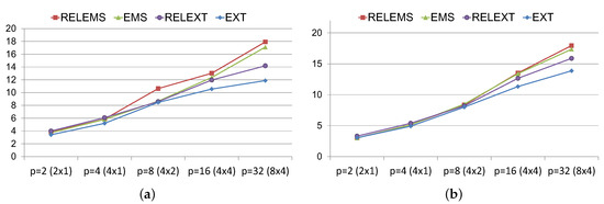 Taking into account the hierarchical hardware design of this HPC cluster, the parallel programming of these algorithms has been done combining distributed memory parallelization on the node interconnect with shared memory parallelization inside each node. For this purpose, there is the option to use pure MPI (Message Passing Interface) [29] and treat every CPU core as a separate entity with its own address space. However, in this work we have combined the MPI and OpenMP (Open Multi-Processing) [30] programming models into a hybrid paradigm, exploiting parallelism beyond a single level. Adding OpenMP threading to an MPI code can be an efficient way to run on multicore processors that are part of a multinode system like this HPC cluster. Since OpenMP operates in a shared memory space, it is possible to reduce the memory overhead associated with MPI tasks and reduce the need for replicated data across tasks [19]. In this way, the parallel environment has been managed using a hybrid MPI/OpenMP model. In order to explain and analyze this hybrid model, we have used similar notation to that used in our previous works [18,19,20]. Concretely, means that s nodes of the HPC cluster are utilized for data distribution and for each one of these nodes, c OpenMP threads are considered. That is, we consider a distributed shared memory (DSM) model with processes or threads. With this notation, if the algorithms are executed in distributed memory (DM) using s nodes, while if the execution of the algorithms is performed using c threads on a single node, that is, in shared memory (SM).