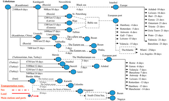 The textile industry of Uzbekistan is innovative, an attractive sector of the economy. In this regard, today, the textile industry of the Republic is strategically essential to develop the technology, innovation, and information activity, as these measures will improve the efficiency of enterprises, and ensure their competitiveness. The rapid development of the textile industry and an increase in the export potential of the industry brings the issue of cost optimization in the supply chain of textile products. Figure 1 shows the logistics diagram of the supply chain of textile products in Uzbekistan, by using which the international delivery of textile products is accomplished. As can be seen from the diagram, delivery is carried out in several ways: by the ground and by the sea. In these circumstances, the need arises in the choice of optimum routes of delivery of textile products with minimum costs on all links in the supply chain.