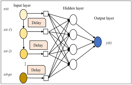 Figure 1 shows the architecture of a TDNN. The structure of the TDNN includes an input layer, one or more hidden layers, and an output layer. Each layer contains one or more nodes determined through a trial and error process of the given data, as there is no theoretical basis. In here, the present study employed one hidden layer in the TDNN’s structure. In addition, as shown in Figure 1, the network input layer utilized the delay components embedded between the amounts of input-units to attain the time-delay. Each node had its own values and through the network computation to achieve the output results. Under the input–output relationship function of the network, if the output result is the next time prediction of the input x, there must be a certain relationship between present and future. This is given by y = x(t + 1) = H[x(t), x(t − 1), …, x(t − p)]. Consequentially, the TDNN is to seek the relationship function H of the input–output in the network. This is given by and where and are the function at the input and output layers, respectively; p is the number of tapped delay nodes; is the weight of the ith neurons in the input layer into the jth neurons in the hidden layer; and is the bias weight of the jth neurons. The function f represents a nonlinear sigmoid function.