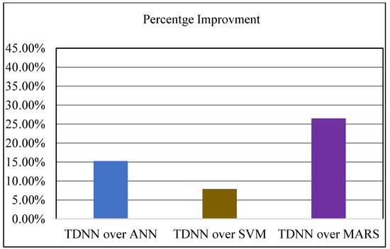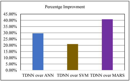 For the quality variables at fault recognition in an MNP5 process, the AIRPI using the TDNN classifier over the ANN classifier was 29.54%. The AIRPI using the TDNN classifier over the SVM and MARS classifiers were 20.94% and 40.80%, respectively. For the quality variables at fault recognition in an MNP9 process, the AIRPI using the TDNN classifier over the ANN, SVM and MARS classifiers were 15.25%, 7.86%, and 26.49%, respectively. Figure 2; Figure 3 display the AIRPI obtained by employing the proposed TDNN classifier over the ANN, SVM and MARS classifiers for an MNP5 and an MNP9. As shown in Figure 2; Figure 3, considerable accuracy improvements can be achieved by using the proposed TDNN classifier.
