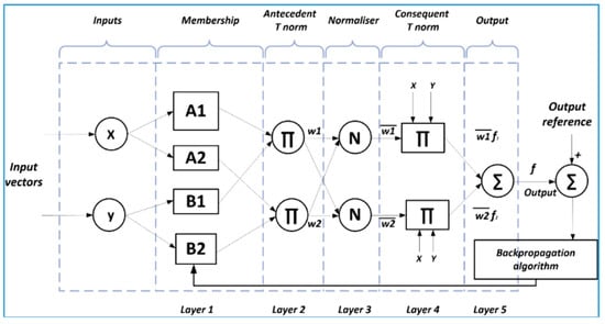 The basics of the ANFIS method are approximately similar to a fuzzy system developed by Takagi, Sugeno, and Kang [102,103]. In the reverse spread learning capability of the ANFIS method, which is based on the calculation of the derivatives of squared errors in a backwards manner from output nodes to the input ones, a robust learning methodology based on a gradient least squares approach is constructed and utilized. To determine the consequence factors in the forward section, a least squares approach is utilized. Then, the preset parameters are reset by gradient descent in the regressive advance [104]. The adaptive network is constructed of five layers. Figure 1 shows these layers, their nodes, and connections with the assumption of two inputs into the fuzzy inference system expressed by “x” and ”y” and a single output of “f”. As an explanation of the configuration of ANFIS, it must be noted that two fuzzy ‘if–then’ rules were utilized which follow Sugeno FIS as: