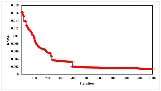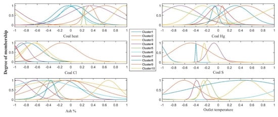 where the number of parameters for optimization is denoted by NT, Nmf is used to show the number of Gaussian membership functions, and Nυ and Nc show how many variables and clusters are used in the model, respectively. It is noteworthy to state that in this study, Gaussian membership function, seven input and output variables, and 10 clusters were used. Data were divided into defined clusters and, following this, cluster centers were calculated and used to construct the fuzzy base of the ANFIS approach. Eventually, using a PSO algorithm, optimization was conducted for 140 tuning parameters. As is shown in Figure 3, to evaluate the functionality of the PSO algorithm, a root mean square error (RMSE) analysis was used. The results show that with a total number of 1000 iterations, the minimum value of the RMSE was reached. Figure 4 indicates the trained membership function parameters for each input variable. It can be seen that the results of the presented model were in good agreement with the obtained data, which is the result of the great learning capability of the developed ANFIS model. Figure 5 illustrates the obtained data on mercury emissions versus the testing and training of the ANFIS hybrid system.