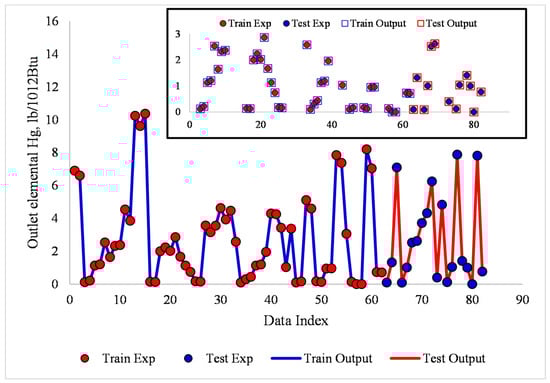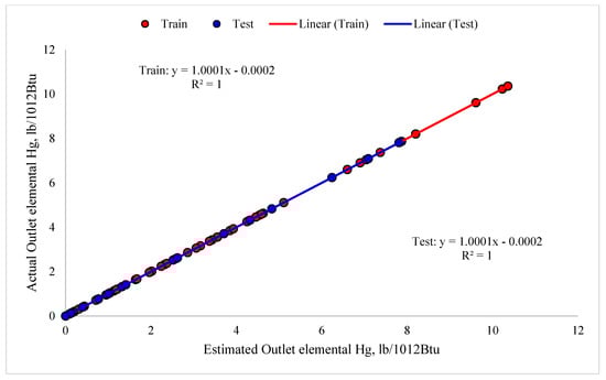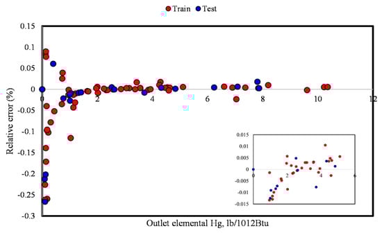 A scatter diagram is a straightforward statistical technique used to indicate a relationship between two parameters. It is frequently joined with a simple linear regression line used to fit a model between the two parameters. As is shown in Figure 6, actual and predicted mercury emissions are located on a straight line with an approximate slope of 1 (45° line), which indicates that the obtained information and the ANFIS predicted data are in good agreement. The obtained cross-fit line in both the testing and training datasets had an equal to 1, which shows the accuracy of the model. To compare the results of the model and evaluate its precision, the method of mean absolute relative error was used. For the training and testing steps, using the mean absolute relative error percentage (MARE%) method, percentage values of 0.003266 and 0.013272 were calculated, respectively. The resultant relative deviations are presented in Figure 7. Low relative deviations were observed due to the accurately predicted values. Different statistical analyses are also presented in Table 1 for the suggested model.