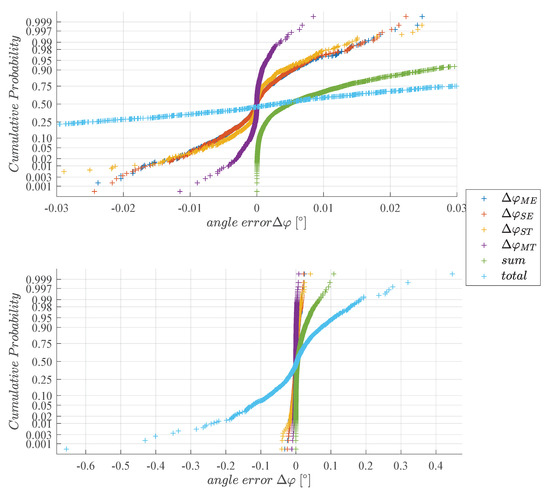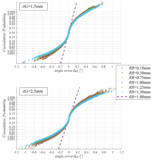 The results of the two Monte Carlo simulations for and mm air gaps are depicted in Figure 3 as normal probability plots. All distributions of angle errors relate to an angular position, ; however, the distributions are identical at any other rotational position . In this plot, a Gaussian distribution appears as a straight ascending line through the median, and its slope is determined by the interquartile range of the distribution. We plotted one such Gaussian distribution with standard deviation equal to the one of the Monte Carlo results for . Obviously, there is a striking difference between the Monte Carlo results and the approximated Gaussian distribution: the Gaussian distribution underestimates the percentile by more than three times (Figure 3).