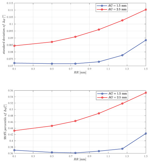 Figure 4 shows the standard deviation and the percentiles versus RR for the data of Figure 3. Apparently, the angle error increases only slightly with the reading radius, especially near the optimum air gap of mm. (Compare with Figure 6.) It appears that the reading radius should at least be smaller than one third of the magnet radius ().