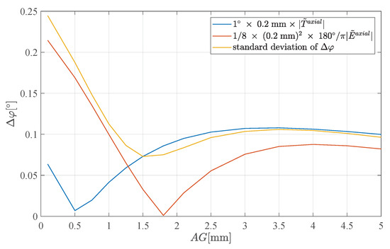 The angle error in Equation (25) consists of three parts: the first part is proportional to , the second part is proportional to , and the third comprises the remainder. The remainder comprises only tilts, not eccentricities, and it gives notably smaller values than the first two parts. If the magnet produces a homogeneous field gradient (that means does not vary in space), both shape functions vanish: and . In the optimization of an axial field gradient angle sensor system, one looks for magnets with vanishing shape functions. For simple magnet shapes like short cylinders, it turns out that both shape functions have a zero, yet at different air gaps. The tilt shape function vanishes at smaller air gaps than the eccentricity shape function. Due to the statistical superposition of terms and terms in the angle error, the total error has a relative minimum versus air gap for air gaps between both zeros. The exact location of the minimum depends on the relative magnitudes of the - and -terms. This is shown in Figure 6, where we plot the standard deviation of versus AG for mm. In the same plot, we added an exemplary tilt error term, , and an exemplary eccentricity error term, .