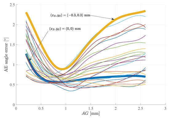 Experiments conducted on a single test chip (with mm) prove the statements above. Figure 7 shows the angle error versus air gap, whereby each curve was measured for a different sensor eccentricity. The sensor eccentricity and was changed in the range of mm by mounting the sensor on a translation stage. The sensor tilt was nominally zero but we could not avoid possible tilts of the sensor chip inside the sensor package (up to ). Also, the magnet was mounted as perfectly as possible, but again here we cannot exclude that there might have been small magnet eccentricities (up to mm), small tilts of the magnet (up to ), and small tilts of the magnetization inside the magnet (up to ). However, all these unavoidable small assembly tolerances were constant for all curves, because we used a single chip and we did not change the mounting of the chip on the translation stage during the experiment, so that only the sensor eccentricity was changed via the translation stage. The measured AE angle error is defined as half the difference of maximum and minimum angle error in a 360 rotation: AE=[max− min/2. The remaining error results from unavoidable sensor tilt, magnet tilt, and magnet eccentricity, as well as errors generated in the signal processing path of this non calibrated part. Note that all curves were measured with the same chip and magnet with constant tilts and magnet eccentricity—only the sensor eccentricity was changed. The highlighted curves show the typical dependency from Figure 6.