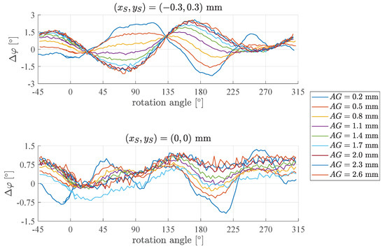 The angle error versus rotation angle for the two bold curves (yellow, blue) in Figure 7 is shown explicitly in Figure 8. The angle error curves show one pattern at large air gaps of mm and a different pattern at small air gaps of mm (compare this with the zeros of and in Figure 6). is dominating the error contribution for small , whereas is the dominating error contributor for larger . The curves for mm should be similar in both plots (as the tilts were not changed), and their respective minima and maxima are roughly at the same angle. The deviations between the two curves result from the contribution of .