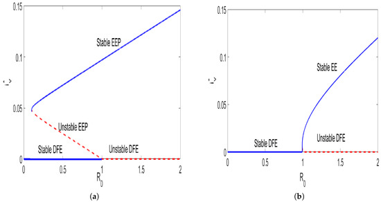 The occurrence of a backward bifurcation, where a stable disease-free equilibrium coexists with a stable endemic equilibrium, is a common phenomenon in vector-borne disease models—more often for model that incorporates disease-related death for the host [33]. Since model (3) has disease-related death for both animals and humans, in what follows we check if the model does indeed have a backward bifurcation. To investigate the possibility of this phenomenon, the discriminant of Equation (4) is set to zero ( and solved to determine the critical value of , denoted by , as follows: