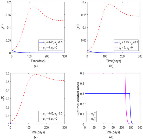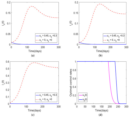 where , and are constants and are equivalent to 100,000, 10,000 and 50,000, respectively. Figure 2 shows the dynamics of Trypanosoma brucei rhodesiense with and We can observe that in the presence of optimal intervention strategies, the proportion of infectious hosts and vectors would never exceed the initial assumed population levels (1%). In particular, in the presence of optimal awareness and insecticides use, the population levels for the hosts and vectors converged to the disease-free equilibrium suggesting that the aforementioned optimal control mechanisms could lead to disease eradication. Precisely, we noted that in the presence of optimal control, the total numbers of new infections for the human and animal populations generated over 300 days were , , respectively, and the total cost was However, in the absence of optimal controls (i.e., ), one can observe that the disease persisted. In Figure 2d, we observe that the control profiles of and started at the maximum, and they remained there for approximately 200 and 250 days, respectively, suggesting that awareness campaigns could essentially be ceased after 200 days of implementation while insecticides use needed to be maintained at maximum strength for an additional 50 days.