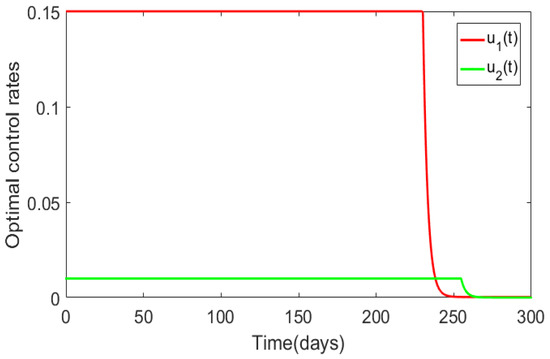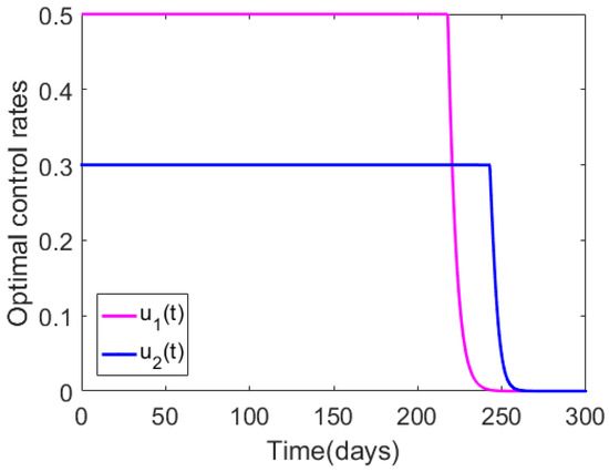 Figure 3 shows the optimal control profiles for and when the upper bounds for these controls were less than unity (i.e., and ), with initial guesses of the controls set to and . We again see that both and started from their maxima, and they stayed at the maximum strength for much longer periods of time than the previous case (compared to Figure 2), due to the reduced intensity bounds. When the upper bounds of the controls were reduced, the population levels for all the infected species would converge to zero within the defined time interval, (the figures were omitted since their behavior was analogous to that of Figure 2). We also note that by reducing the bounds for the controls, the total cost was reduced %, compared to that of Figure 2.