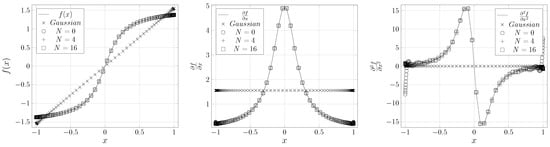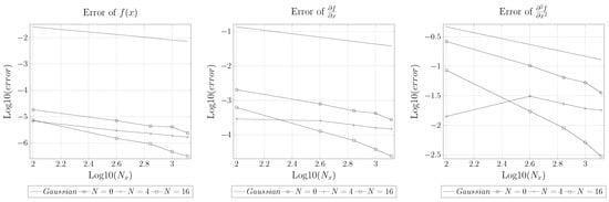 The previous results indicate that the order of truncation does not affect the accuracy significantly. These results do not consider the variation in the mesh size, which could affect the accuracy or exhibit low convergence. The results of benchmarking the one-dimensional model function at a constant shape parameter () and variable stretched mesh sizes are presented in Figure 4. The results exhibit a reasonable convergence for the suggested Hermite expansion which is comparable to that of the Gaussian RBF in the worst-case scenario (). For , the present Hermite expansion approach displays a marginally higher convergence. For , the convergence is reasonable for f and . However, for the second derivative, unusual behavior is observed—the results diverge at () and converge otherwise. This is likely to be a result of using a lower value of N or . If either of them increases, the convergence improves. It can be concluded that the convergence can be improved by increasing the order of truncation.