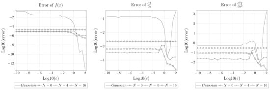 In the previous sections, it is stated that the proposed expansion of the RBF improves accuracy and stability over a broader range of the shape parameter. This statement was verified by approximately a one-dimensional model function and its derivatives (Equations (39)–(41)) with 80 stretched mesh points at . The results are plotted in Figure 1. It is evident that the proposed model outperforms the Gaussian RBF regardless of the expansion order (N). Moreover, the second-order derivative is observed to fluctuate near the boundaries of the domain. However, this fluctuation decreases as the order of approximation (N) increases. The accuracy comparison may not be conclusive since it is a qualitative comparison. Consequently, a quantitative comparison of accuracy was performed. It is established that RBF accuracy is a function of the shape parameter and mesh size. Therefore, it is more convenient to fix a parameter and vary the other parameter while comparing the accuracies.