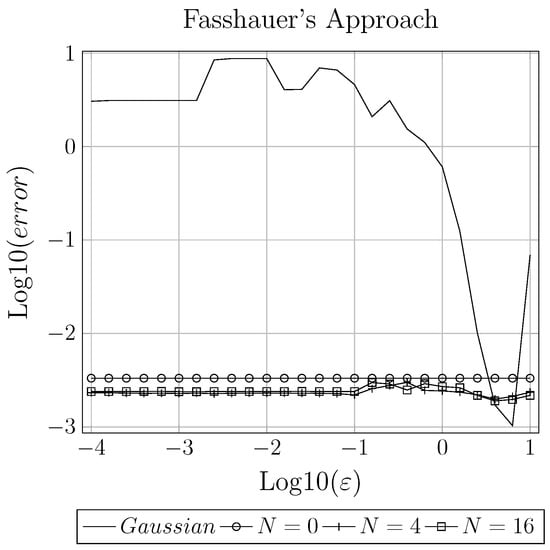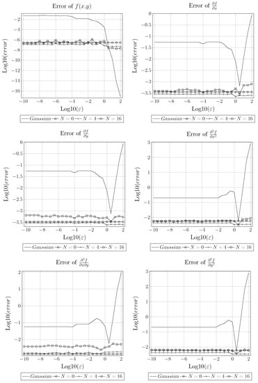 The accuracy of the present Hermite expansion approach for approximating two-dimensional functions was evaluated, and 900 randomly distributed points within the range [−1,1] in both x- and y-directions were used. The results are plotted in Figure 3. The present Hermite expansion approach is observed to exhibit higher accuracy than the Gaussian RBF. The fluctuation in accuracy over the range is insignificant. Furthermore, the expansion order (N) affects the accuracy marginally. Consequently, the results of the Hermite approach are remarkable and predictable, this is because it does not vary significantly with the shape parameter or with the expansion order.