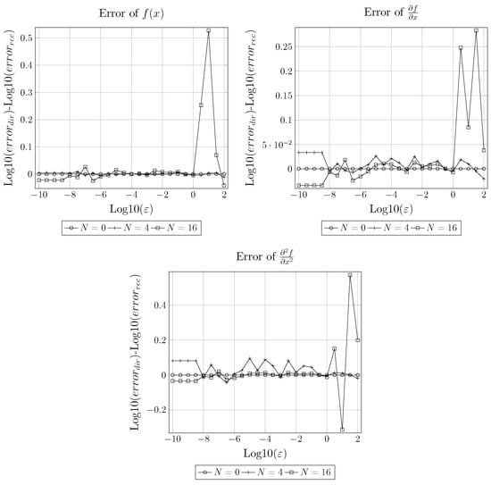 Comparison between direct and recursive approaches by varying for a specified function and its first two derivatives. The number of mesh points is fixed at 80 stretched points within the range [−1,1].