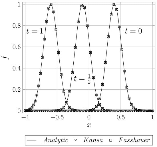 The advection equation was used as a benchmark for the new approach because it is a hyperbolic PDE equation, which is challenging to solve accurately and is very sensitive. The one-dimensional advection equation was solved within the range [−1,1] using the RBF method. The initial condition () used here is similar to that in [33].