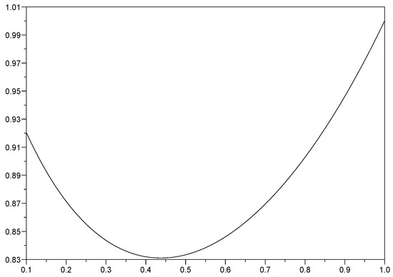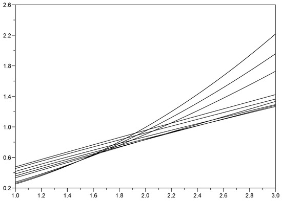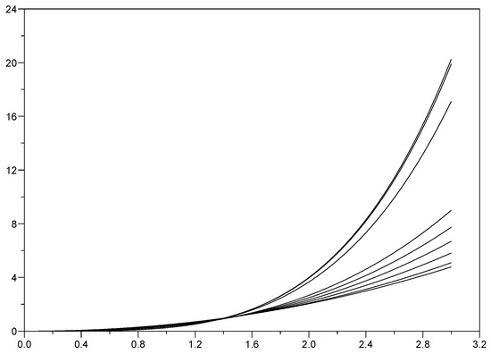 In Figure 2, we plot given by (20), as a function of for fixed, and various values of This figure presents some analogies with Figure 1 of [15], where the covariance function of the fractional Riemann–Liouville integral of BM of order is shown for various values of
