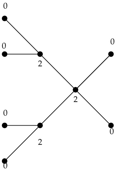 Now assume that is a -function. We first assume that . Then we can extend to a -function by assigning the weight 2 to , the weight 1 to and the weight 0 to the remaining vertices of T. This is a contradiction since every -function assigns to the vertex the value 2. Next, assume that . If for every vertex with , there exists at least one vertex with , then we can extend to a -function by assigning the weight 2 to , the weight 1 to and the weight 0 to the remaining vertices of T. This is a contradiction since every -function assigns to the vertex the value 2. Hence, we can assume that every -function assigns to the vertex the value 2.