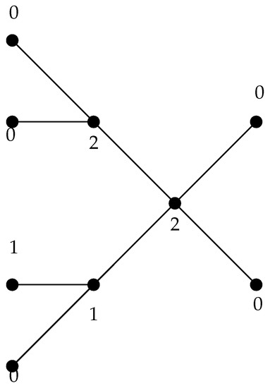 Note that for every graph G. Clearly, if G is a graph with , then every -function is a -function. However, not every -function is an -function (see Figure 2), even when . For example, consider the path . We say that and are strongly equal, denoted by , if every -function is an -function. In this paper, we provide a constructive characterization of trees T such that . Other interesting examples of characterizations for strong equalities have been discussed in [4,6,7,14,15].