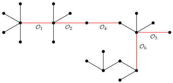 Let F be the tree depicted in Figure 3 and be the collection of trees T that can be obtained from a sequence of trees, where is a star with , and can be obtained recursively from by one of the following six operations defined below and illustrated in Figure 4.