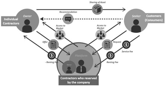 This paper deals with a sharing economy platform with critical operational factors which include a status of the owners (contractors, suppliers) and seekers (subscribers, customers) under the sharing economy. Basically, the sharing economy platform makes the collaborative consumption by the activities of sharing, exchanging and rental of resources without owning the goods []. Growing concerns about climate change have made the collaborative consumption an appealing alternative for consumers []. This concept describes in a broader sense any sales transactions which are done in online market places, even in business-to-business (B2B). This sharing economy began to spread widely by sharing unused resources between individuals. Startup companies including Uber and AirBnB not only provide technological platforms to facilitate transactions but also become real-world companies, with the same responsibilities as transportation companies under the sharing economy platforms [,]. The constituent factors of a sharing economy business model could be largely divided into eight factors for the business operations—value proposition; financial profit and loss; resources; process; target customers; exterior cooperation; and logistical flow []. The operations must evolve along with the new sharing business model and they should preserve the value created through innovation. This paper deals with modeling the business operations between resource owners (suppliers) and consumers (customers). As a platform provider, a manager should control the balance between them. This paper suggests that resource owners have two main types of contract in the sharing economy platform. Individual contractors are typical suppliers in the system which are independent and have fewer obligations but company contractors who are directly reserved by a platform provider have more obligations to support goods. The relationship between a platform provider and various types of suppliers in the sharing economy system is described in Figure 1.