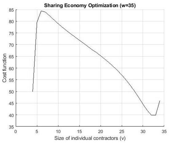 As an illustration in Figure 2, let us take and . The inter-duration between posting one bulk of contracts on the (online) platform is exponentially distributed with the mean and the parameter of consuming services by customers is . Take the maximum number of contracts (suppliers) as 35 and the maximal bulk size of the individual contracts must be smaller than the size of the total capacity w . Now, we calculate and which gives a minimum for . In other words, the control level stands for the optimal batch size of the individual supplier contracts which minimizes the total operating cost of the sharing business. Below is a plot of for .