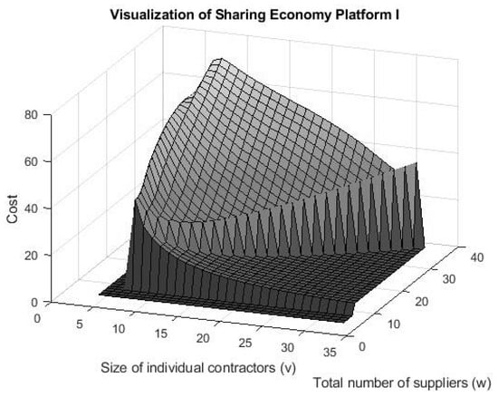 Our calculation yields that for which the minimal cost equals . When the total number of the allowed suppliers is 35, we obtain the threshold value which gives us the decision point that is the number of bulk contracts for the individual suppliers to minimize the cost of the sharing economy system operations. It also indicates that only 2 suppliers are reserved by the platform provider (i.e., . In addition, it is also feasible to visualize the cost objective function with two variables in the platform (see Figure 3).