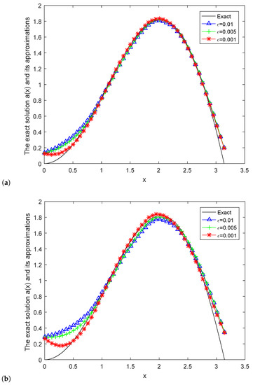 Because the a priori bound is not well defined, only the numerical results under the rules of selecting a posteriori regularization parameters are given here. In the next instances, , and ; for the sake of inverting the unknown function , we order ; for the sake of inverting the unknown , we order .