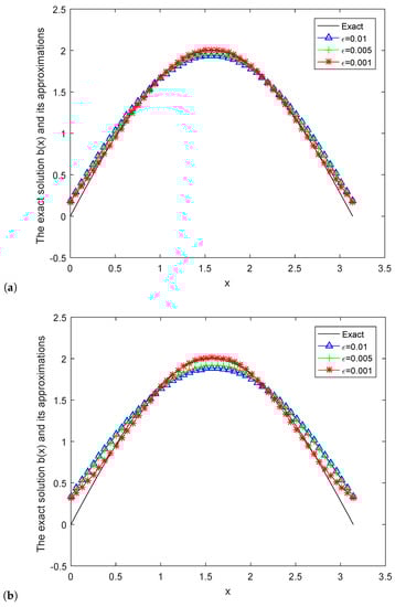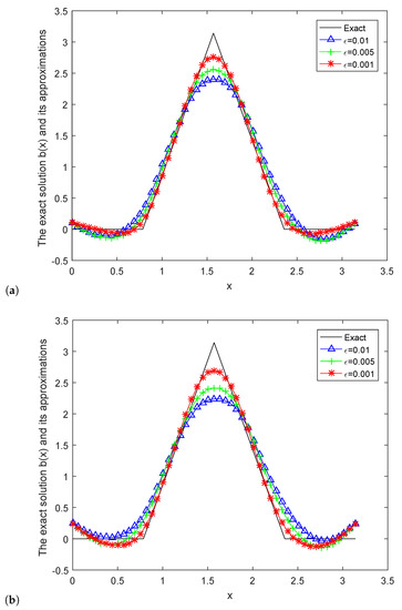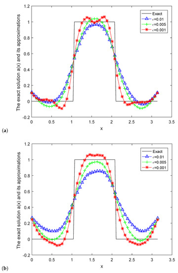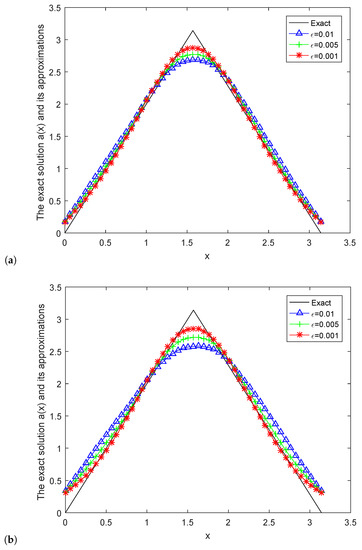Figure 1 shows the absolute error between the exact solution and the regularized solution under and various for Instance 1. Figure 2 shows the exact solution and the regularized solution for Instance 1 with difference . Figure 3 shows the exact solution and the regularized solution for Instance 2 with difference Figure 4 shows the exact solution and the regularized solution for Instance 3 with difference Figure 5 shows the exact solution and the regularized solution for Instance 4 with difference Figure 6 shows the exact solution and the regularized solution for Instance 5 with difference Figure 7 shows the exact solution and the regularized solution for Instance 6 with difference .