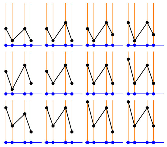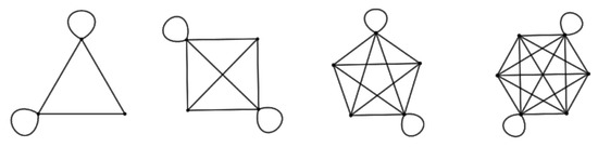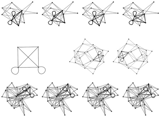Figure 21 shows the complete graphs isomorphic to the cliques corresponding to Theorem 17. Figure 22 explores the set . The p values all consist of three distinct primes; hence, by Theorem 17, we see the maximum cliques are complete graphs of 4 vertices (plus self-loops). The set of maximum cliques are of size 4 for and (2 to the first power). Further, vertex 0 and vertex are both contained in each clique. There are only two maximal cliques for (2 to an even power), one containing vertex 0 and the other containing vertex .