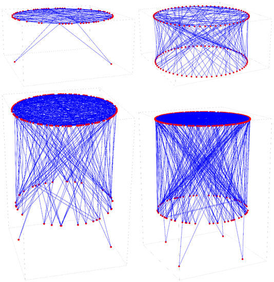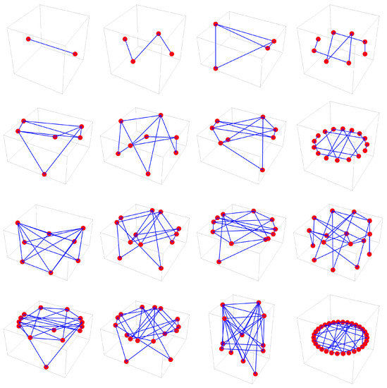 A example is the family. There are actually two sub-families, one for n odd and one for n even. These antipodal condensed graphs are captured in Figure 17 where along the top row and along the bottom row. Of particular note is the similarity in overall morphology within a subfamily. This is related to the scaling properties of the prime graphs and is discussed in detail below.