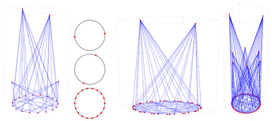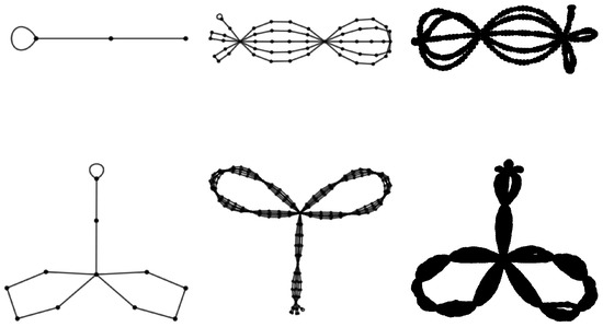 Perhaps more importantly, the reverse of the renormalization scheme can be performed. Here, each edge is replaced with a spray of q paths; each path having q edges. In a sense this acts to “fractalize” the graph. Consider again Figure 16, Figure 19, and Figure 20. The third graph in the top row of Figure 16 is . Considering the ultimate vertex and comparing with Figure 19 one sees the five edges become five groups of five. Then, comparing with Figure 20, one sees 125 edges grouped in the five groups of five, which are further grouped into five. The other vertices behave similarly. Thus, the act of raising the power on the prime is akin to zooming in on a fractal object. Relatedly, the actual fractal character as manifested by Julia sets for the centered polygonal lacunary functions has recently been investigated [26].