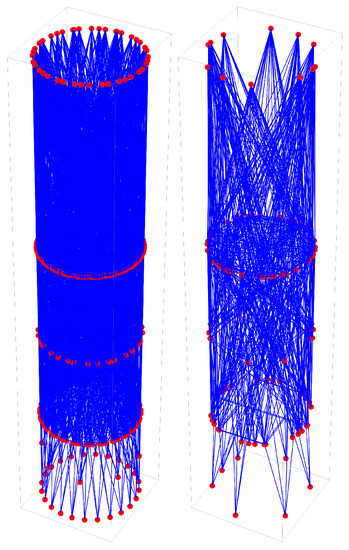 Figure 20 shows as a concrete example of a graph containing a second-order spray. The left panel shows the entire graph. Unfortunately, the large number of vertices obscures the details of the connectivity. The middle panel shows a blow-up the ultimate vertex. There are 25 first-order spays connecting the ultimate vertex with adjacent antepenultimate vertex. These 25 first-order sprays are clustered into five second-order sprays, which connect the ultimate vertex with the five adjacent penultimate vertices. Similar to above, the case of is representative of general features. At the level, there are the same number of petals and stalks. Each petal contains penultimate vertices. In between each of these are antepenultimate vertices and in between those are degree 2 vertices. All second-order sprays contain first-order sprays.