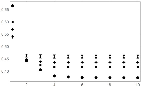 Lemma 1 connects the triangular numbers to the p-sequence of limit values of at the natural boundary along the set of pth symmetry angles. The pth symmetry angle is . The Nth member, , of the p-sequence is part of a -cycle of values. The -cycle reduces to a -cycle when considering rather than . A factor of is the only factor that carries k dependence and is present in every term. Hence, . The sequence of has its own structure as it follows a -cycle. The index of that -cycle is and represents under the mod. This yields a structure for the of the form . Consequently, only p, rather than , distinct must be determined. A very simple expression for the values exists [18]:
