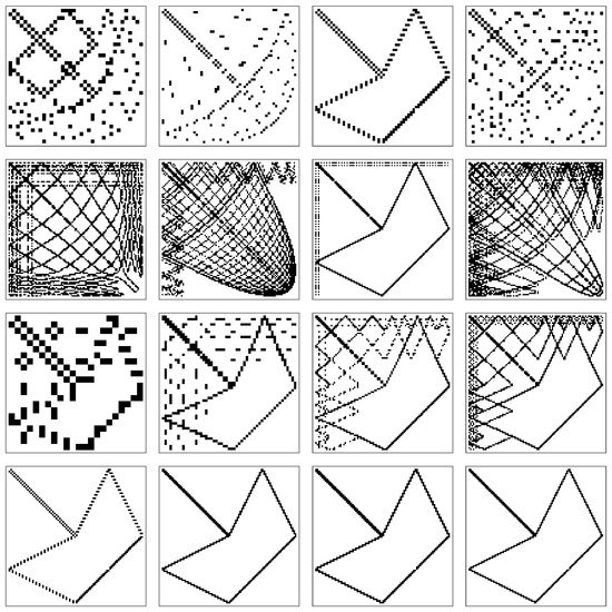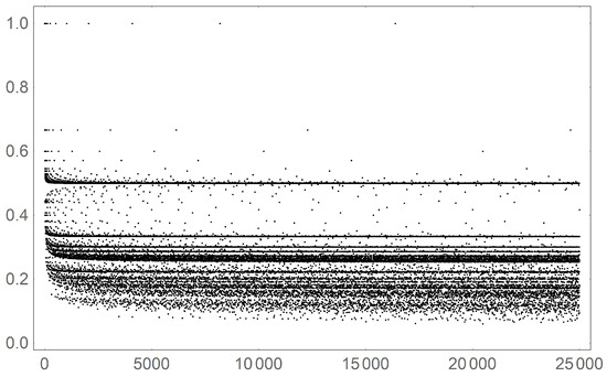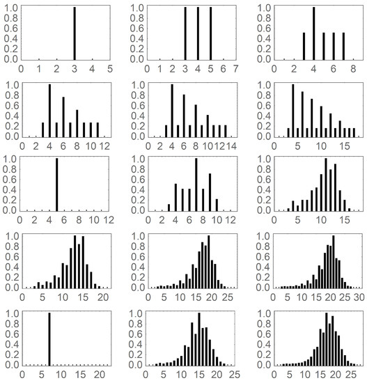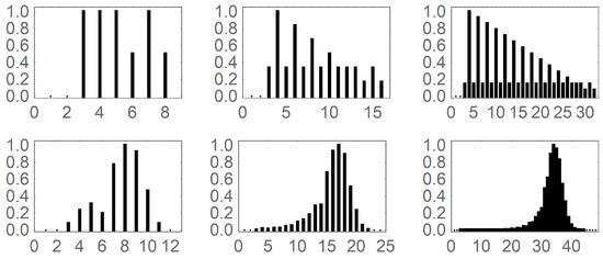 One can examine the nature of the cycles appearing in the graphs. This can be done by calculating a normalized cycle spectrum, which counts the number of different cycle lengths present in a given graph normalized by the largest value. Several normalized cycle spectra are shown in Figure 23 and Figure 24. In the former case, the normalized cycle spectra for graphs, for , , and where q is an odd prime. Expectedly, when in the first case, 5 in the second case, and 7 in the third case, one sees a single spectral line at q. The cases of are interesting in that they clearly exhibit a self-similarity scaling as can be seen by inspection of the top two rows of Figure 23. In contrast, the cases of and behave more typically. As the value of p increases, the spectrum becomes more Gaussian-like as seen in the bottom three rows of Figure 23. For the cases of graphs in which , again has special character. The top row of Figure 24 shows the normalized cycle spectra for and, indeed, these spectra display a self-similarity and are quite distinct from those shown in the bottom row which are for the cases of .
